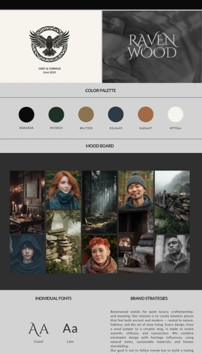 This stage included defining the colour palette, selecting typography, and designing the overall visual style that Ravenwood Co would use across its online presence.